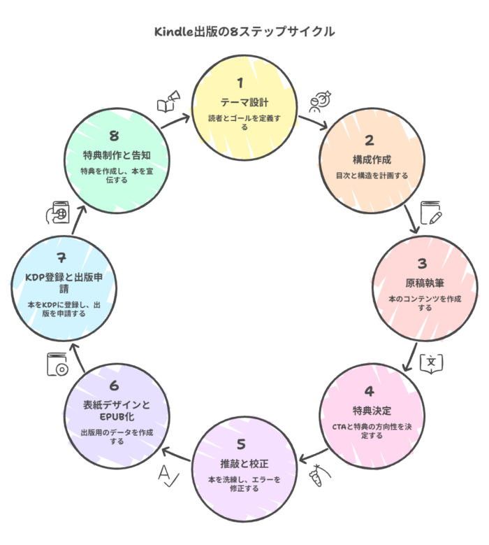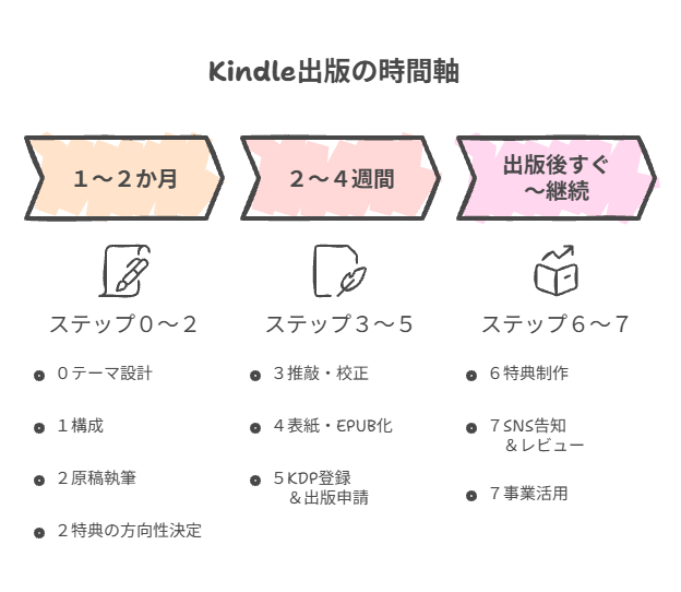 | 出版 | 2〜4週間 | 3〜5 | 推敲→表紙・EPUB化→KDP登録・出版申請 |