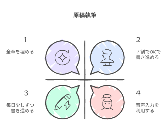 | 2 | 原稿執筆 | 本文を書く+巻末CTAと特典の方向性を決める |