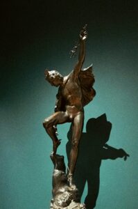 神話では「ヘルメス」という神さまで、翼のある靴で世界を駆けまわり、神々のメッセージを人に伝える“伝令役”でした。